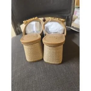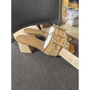 The Women's Kathleen Raffia Buckle Block Heels in Beige by A New Day are a stylish and versatile option for any outfit. These mid-height block heels feature a square toe shape and a trendy strappy design, perfect for a party or cocktail occasion. The neutral beige color makes them easy to pair with a variety of ensembles, while the buckle closure adds a touch of sophistication. Made with raffia material, these heels offer a comfortable and fashionable option for the summer and spring seasons.