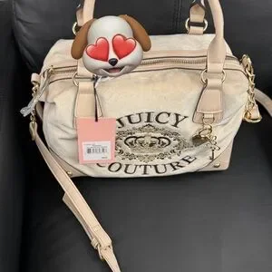 Juicy Couture crossbody satchel in soft beige velour. Features embroidered logo and crown detail. Gold-tone hardware and charm accent. Detachable strap for shoulder or crossbody wear. Elegant everyday style.