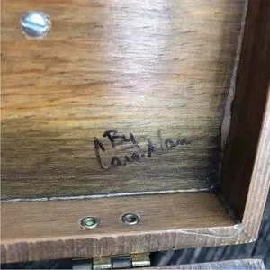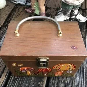 Would also make a cute makeup case. Design on all 4 sides. Gold metal handle. Gold feet. Red gingham plaid lining. Mirror on inside.