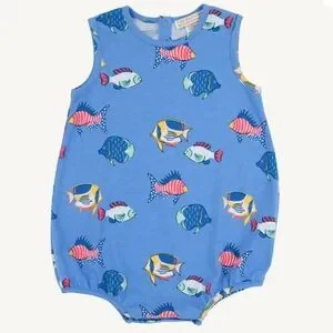 Sleeveless blue romper with colorful fish print. Bright multicolor fish in pink, yellow, green, navy and white. Snap closure at the bottom. Soft knit fabric. Fun seaside design.