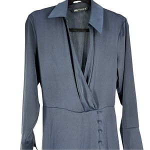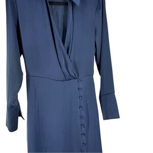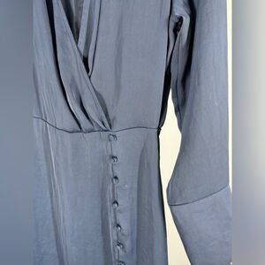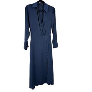 Zara Navy Satin Midi Faux Wrap Dress Button Slit Long Sleeve Navy Blue small