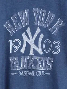 - Navy with white distressed graphics "New York Yankees Baseball Club 1903" and the iconic interlocking NY logo