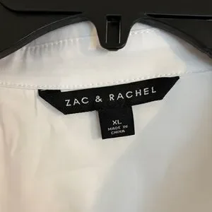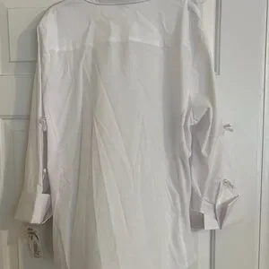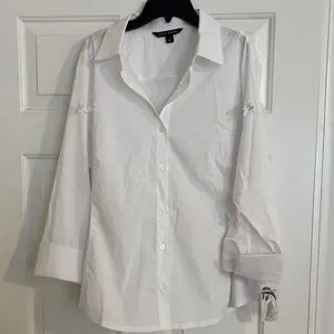 Crisp white button-front blouse. Collared neckline with long sleeves and tie details at sleeves. Clean, versatile style for work or casual wear.
