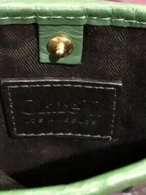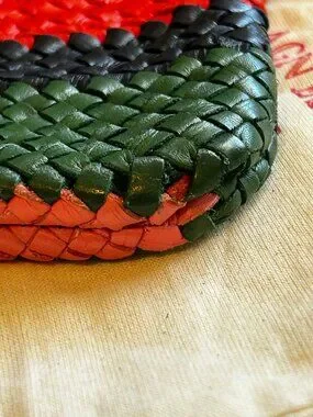 "Poche" is an Artisan mini pouch bag hand crafted and hand woven from genuine leather and braided into beautiful vibrant green, red, and black stripes, with a small card size solid green leather patch pocket on the exterior, black leather logo patch inside with green leather patch and gold metal snap closure, black grosgrain lining,and an Engraved Round Gold Metal Logo Charm on the side.