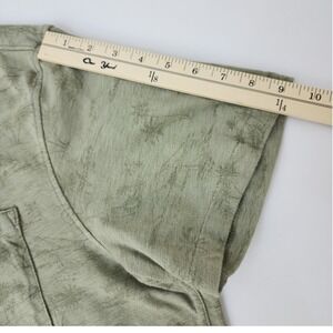 American Eagle short sleeve button down shirt in a muted olive green with an all-over tropical palm tree print. This lightweight top features a soft jersey-like texture, a classic camp collar, and a single chest pocket. The subtle, tonal pattern provides a relaxed vacation vibe perfect for casual summer wear or travel. Finished with a straight hem and side vents for a comfortable fit.