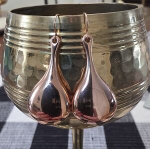 Shiny teardrop dangle earrings in a warm rose gold tone. Simple hook backs. Sleek, reflective finish for a modern look.