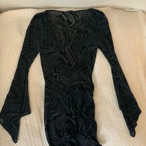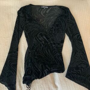 Iconic I.AM.GIA Amina mini dress in black with a sheer animal print design and lace-up front detail. Features dramatic flare sleeves and a ruched adjustable side for the perfect fit. Super flattering and perfect for going out, events, or festival looks. Sold out online and hard to find.