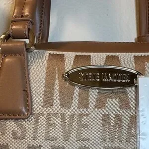 Steve Madden shoulder bag with allover logo print. Beige canvas body with brown trim and straps. Features decorative charm and metal logo plaque. Compact, stylish shape for daily use.