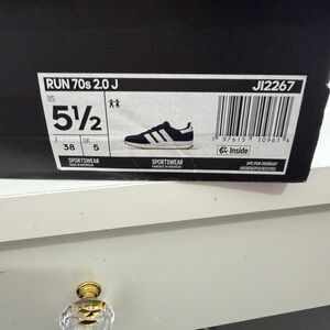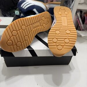 Low-profile retro trainers. Navy upper with white three-stripe detailing. Lace-up closure. Lightweight cushioned sole. Sporty everyday style.