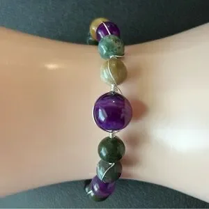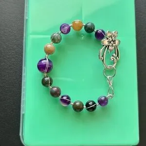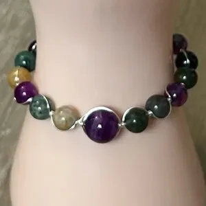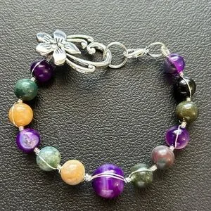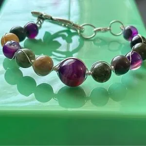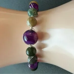 Elegant hand crafted bracelet made with purple (12 mm) and African agate (8mm) wired with silver plated wire (18and 26 gauge) Floral silver-tone ornament. Measurement aprox: 16-18 cms around the wrist. Lightweight and comfortable for daily wear. Perfect as a gift or to complement casual and dress looks.please see all pictures carefully for details.