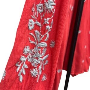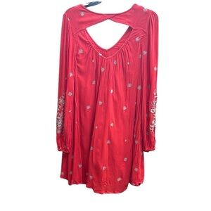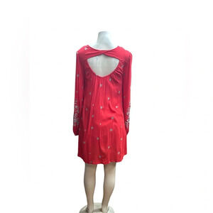 This stunning sundress by Free People features a vibrant red hue adorned with intricate silver embellishments, perfect for a casual or resort setting. The dress boasts a ruffled design with long bishop sleeves and a classic crew neck, offering a blend of elegance and comfort. Its flowy silhouette and detailed embellishments make it a standout piece for any relaxed occasion.