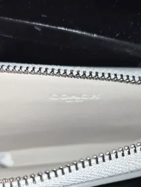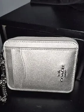 Compact metallic card case with exterior card slots. Shiny silver finish with Coach logo. Zippered top and attached chain for carrying.