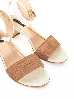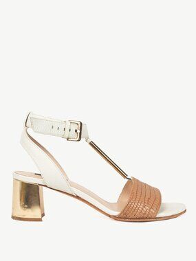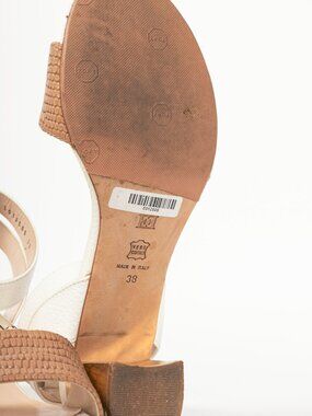 Escada SS14 White & Brown Snakeskin-Embossed T-Strap Mirror-Heel Sandals
