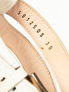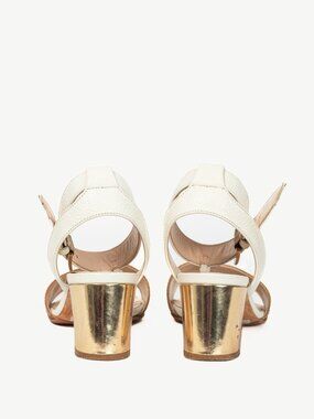 Made in Italy, these sandals from Escada's 2014 Spring and Summer collection are crafted in a white pebbled leather, and feature gold-tone-mirror block mid-heels, open rounded toes, brown snakeskin-embossed trim, buckled T-straps, and leather lining and soles.