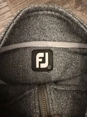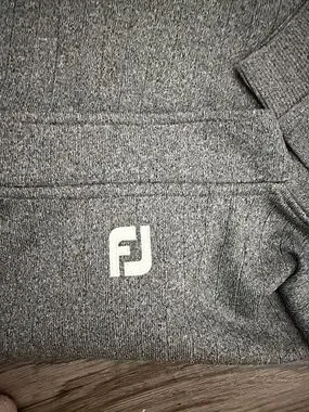 Classic heather gray quarter-zip pullover from FootJoy. Soft knit fabric with ribbed cuffs and hem. Small embroidered logo on chest offers subtle branding. Comfortable layering piece for golf or casual wear.