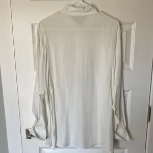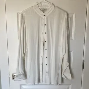 Soft white band collar blouse with front button closure. Long sleeves. Lightweight, fluid fabric and relaxed fit. Simple, versatile styling for work or casual wear.