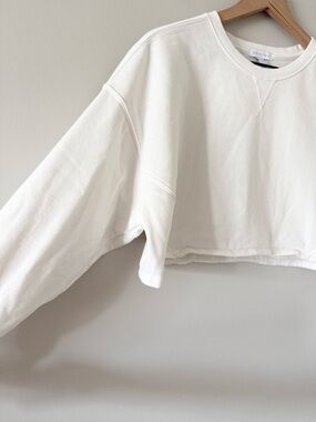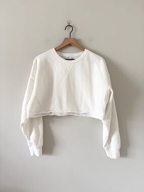 Soft cream cropped crewneck sweatshirt with long sleeves. Lightweight, comfortable fabric for everyday wear. Easy-to-style minimalist design that pairs with joggers or jeans. Includes ribbed cuffs and a relaxed fit for casual comfort.