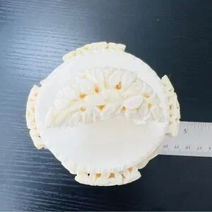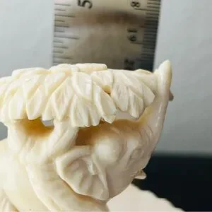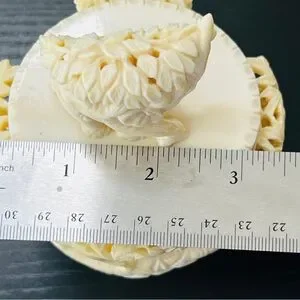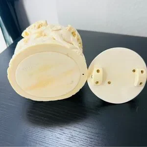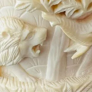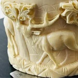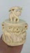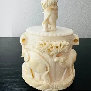 INDIAN CARVED Cream colored BOX, of cylindrical form, carved with lions chasing animals, the cover with an elephant finial in high relief, boxed, 12cm high