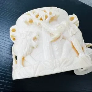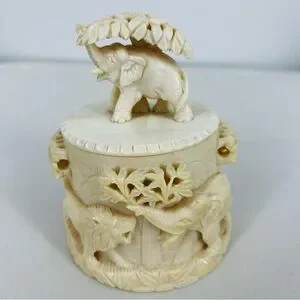 Indian Carved Jewelry Box, early 20th c., the lid with a relief elephant under a tree handle, the sides with relief carving of elephant.