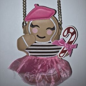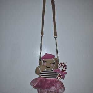 Cute gingerbread girl crossbody bag. Pink beret and pink tulle skirt. Candy cane accent with bow. Gold chain strap. Playful and fun accessory.