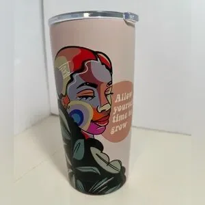 Vibrant tumbler featuring an artistic face design. Includes a clear lid with a black slider.