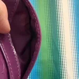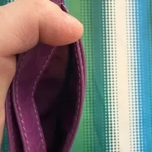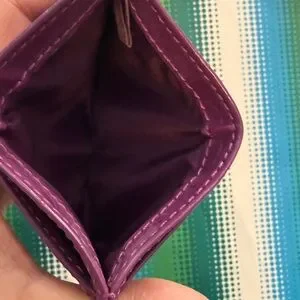 Sleek card holder in a rich purple tone. Embossed signature pattern across the surface. Compact and stylish for everyday use. I think it’s coach but I don’t authenticate.