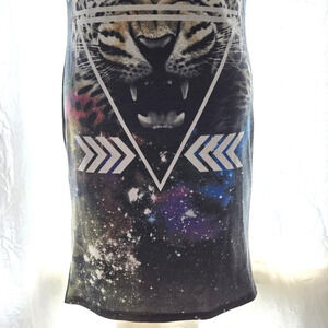Black Dress with fierce white tiger ready to pounce, merkaba white detailing centering your energy, star clusters forming in the universe amid the background. Rather awesome.