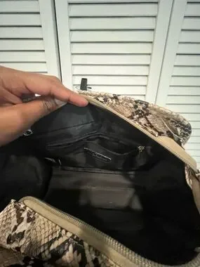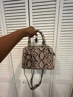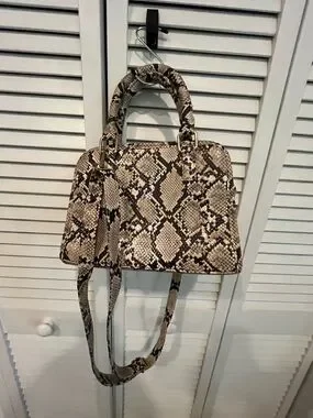 Stylish python-print top-handle bag in beige and brown. Versatile straps convert from hand-carry to crossbody. Secure zip closure and structured shape keep essentials organized. Lightweight and fashion-forward for everyday wear.
