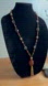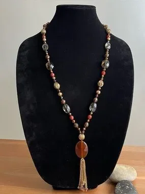 Talbots beaded statement necklace featuring a mix of brown, orange, and gold-toned beads/glass with a tassel pendant. 28 inch. Lobster clasp.