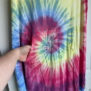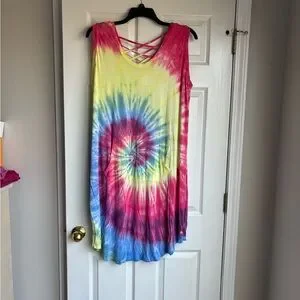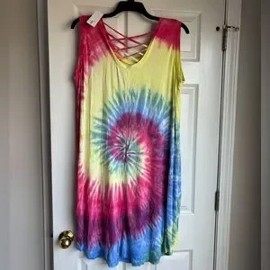 Bright tie-dye mini dress with crisscross back detail. Sleeveless and flowy for easy wear. Soft, lightweight fabric with a spiral color pattern. Bold casual piece for warm days.