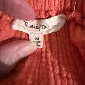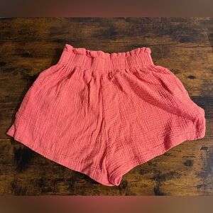 Coral colored cotton gauze shorts with gathered elastic waist. Short inseam, approximately 3”