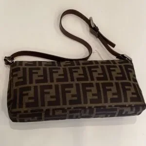 Classic FF Zucca canvas exterior. Dark brown trim and strap. Gold-tone hardware accent. Convertible shoulder strap. Structured silhouette with sleek profile.