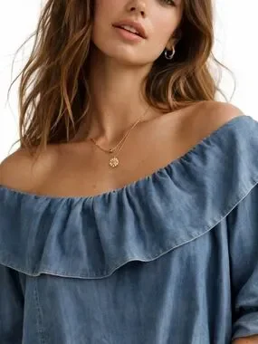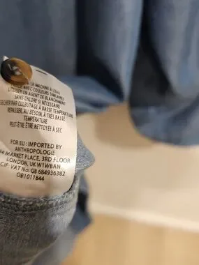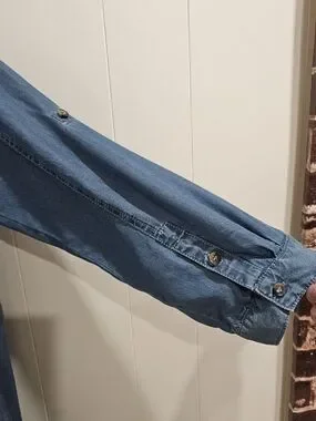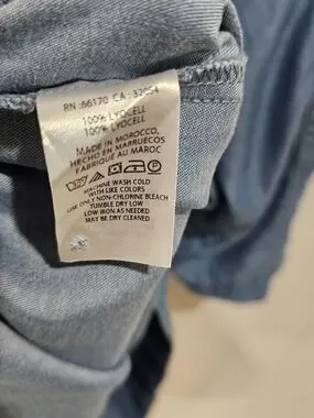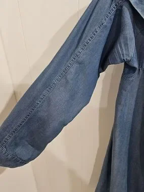 Soft, editorial Anthropologie chambray dress crafted from 100% lyocell for a fluid, elevated drape. Features a statement ruffle neckline, relaxed A-line silhouette, and adjustable roll-tab sleeves. Lightweight and breathable with a clean, minimalist structure—ideal for everyday wear, travel, or a capsule wardrobe.