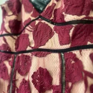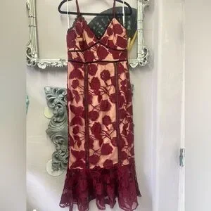 Sleeveless midi dress with V-neckline and adjustable spaghetti straps. Nude lining with burgundy floral lace overlay. Fitted bodice with paneled seams and flared lace hem. Feminine and romantic style for events.