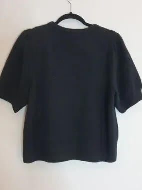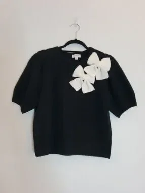 Cece Short-sleeve black knit top with three white decorative bows at the shoulder. Soft textured fabric with a simple round neckline. Cute and easy to style for everyday wear.