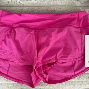 Bright hot pink running shorts with built-in liner. Lightweight, breathable fabric. Double-stitched seams for durability. Sleek sporty silhouette.