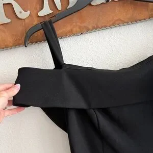 Sleek black maxi dress with an off-shoulder ruffle detail. Fitted bodice flowing to a long skirt. Thin shoulder straps add support. Timeless evening silhouette for formal occasions.