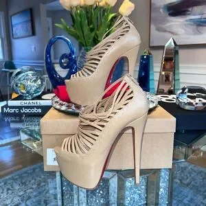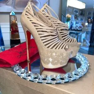 These wild sandals by Christian Louboutin will steal everyone's attention. Crafted from nude leather they feature a caged design with strappy leather fronts. The zipper closure at the back, platforms and heels complete the exotic unique look.