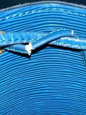 Classic Louis Vuitton bucket silhouette in blue Epi leather. Drawstring closure and adjustable shoulder strap. Gold-tone eyelets and hardware accents. Textured leather finish with subtle brand embossing.