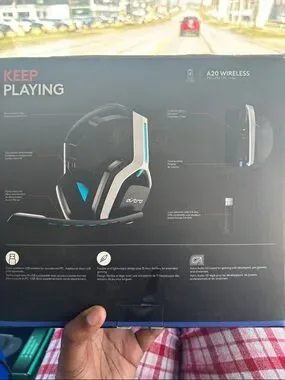 Astro A20 wireless over-ear gaming headset with clear game and chat audio. Comfortable padded earcups and adjustable headband for long sessions. Built-in controls and reliable wireless connection for PS5/PS4/PC/Mac. White and black colorway with blue accent details.