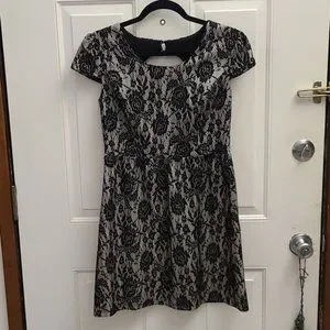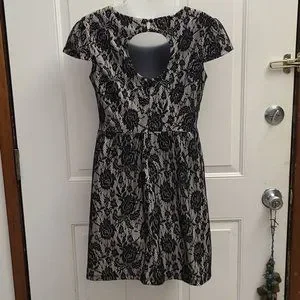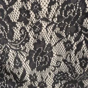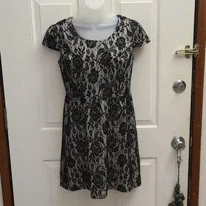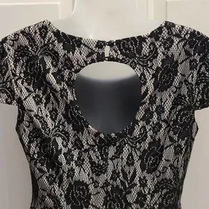 Black lace design over beige, cap sleeve, zip back and 2 buttons at neck. Measures approximately 33" long and 19" across chest laid flat. Excellent pre-owned condition, smoke free home.