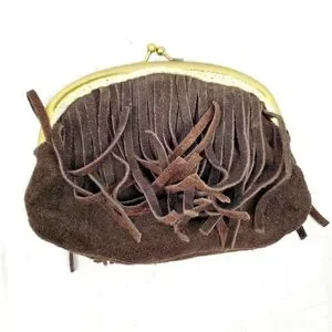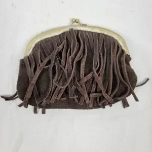 Natural Life brown genuine suede kiss lock coin purse. Fringe and lace trim detail. Interior kiss lock pocket. Good condition, fringe is bent due to storage but can be reshaped, some marks on lace.