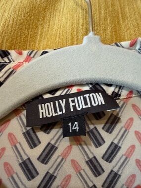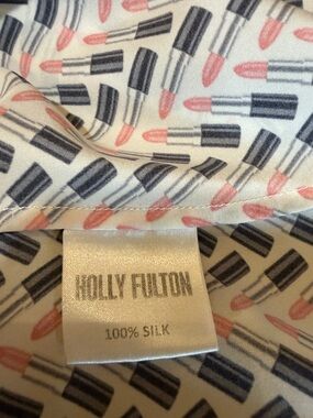 Amazing lipstick (MAC) print on white long-sleeve button-up shirt with a black tubes and orange bullets. Fabulous British designer Holly Fulton designed (this 14uk is an 8 US) 100% silk. Print is soft/ looks faded and dry clean only. Minor stain around the underarms (see photo). Loved this shirt beyond. Must go to a home that will love it.