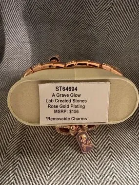 The "A Grave Glow - Halloween 2025 Stack By BP" bracelet is a captivating piece of jewelry designed by BP for the Halloween 2025 collection. It features a multicolor lab-created main stone set in rose gold plated metal, creating a unique and spooky theme perfect for the occasion. The bracelet offers a variety of styles including chain, cuff, wrap, and charm, allowing wearers to customize their look and showcase their love for Halloween. This piece is sure to add a touch of glamour and whimsy to any Halloween outfit.