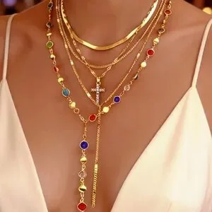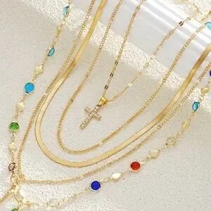 5 pc Copper Alloy gold layered necklace featuring multi-color gemstone accents. Designed to stack with sleek gold chains and a sparkling cross pendant. Adds vibrant red, blue, green and neutral tones to any outfit. Lightweight and eye-catching for everyday or special occasions.