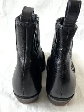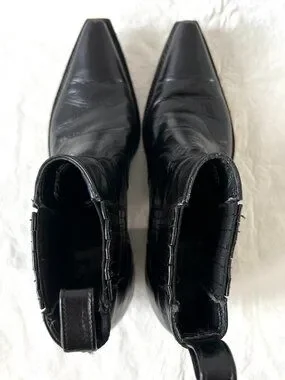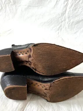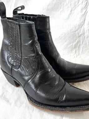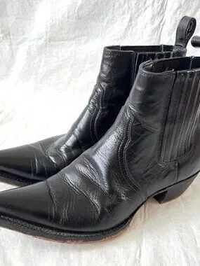 Tony Lama Coco boots, short ankle shaft, black leather, snip toe, pull on, elastic side, rubber soles, 1.5" block heel, US women's 7.5, preowned and shows wear on the soles, scuffing, creasing - see photos