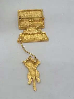 Vtg Signed JJ Brooch Mouse Error Gold-Tone Computer & Cat Dangling Pin Quirky 19