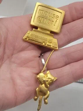 cat pin, computer brooch, vintage jewelry, quirky pin, tech humor pin, dangling brooch, gold-tone jewelry, retro pin, 80s jewelry, collectible brooch, mouse error pin, fun brooch, cat lover gift