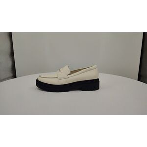 Cream leather penny loafer with a chunky black lug sole. Slip-on design with classic penny strap. Durable lug outsole for traction and style.