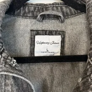 Cropped denim jacket by Highway Jeans. Front button closure with two chest flap pockets. Slightly relaxed fit with elasticized hem. Classic collar and long sleeves. Versatile casual layering piece.